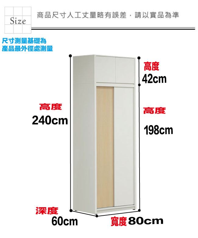 材質 | ◆產品名稱:【綠家居】歐瑞雙色2.7尺開&推門加高衣櫃組合 尺寸:(寬)80x(深)60x(高)240/公分 ◆材質: 材質:防蛀木心板+防潮耐磨底座+防夾手緩衝門片五金+白色面板外層採用皮革紋路特殊處理 噴漆:防潮耐磨噴漆處理 |