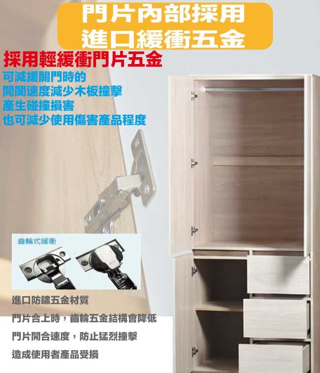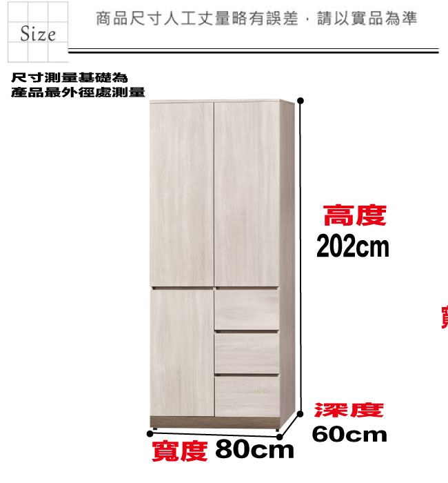 材質 | ◆產品名稱:【綠家居】歐瑞雙色2.7尺三門三抽衣櫃 尺寸:(寬)80x(深)60x(高)202/公分 ◆材質: 材質:防蛀木心板+防潮耐磨底座+防夾手緩衝門片五金+五金滑軌結構 噴漆:防潮耐磨噴漆處理 |