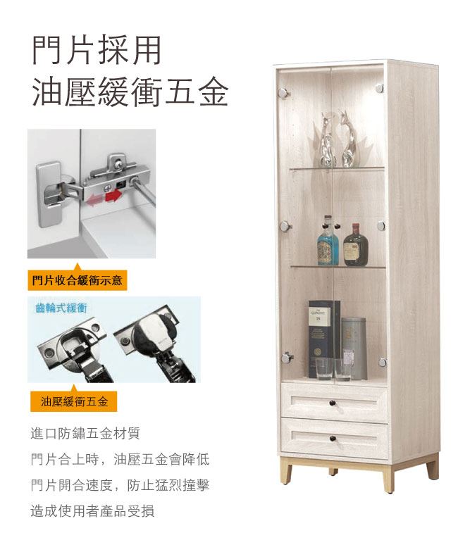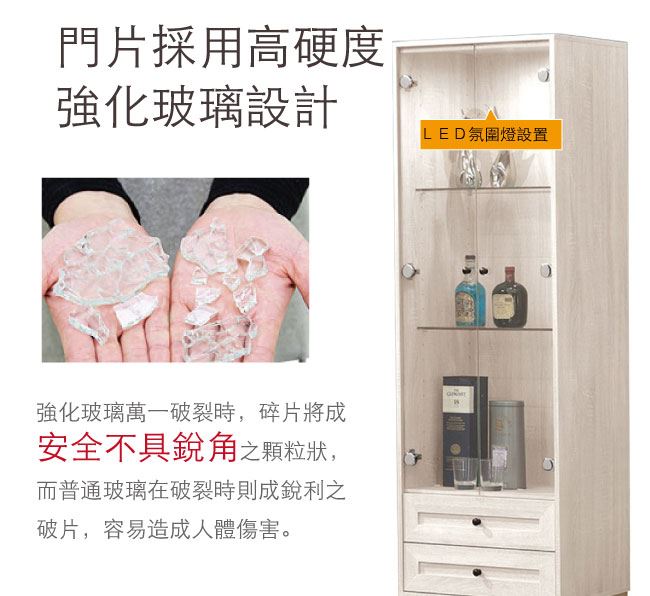 商品 介紹 | 【綠家居】范辛頓 時尚2尺二門二抽展示櫃/收納櫃 淺橡木紋色系+現代簡約風格+安心材質製造,整體採用防蛀木心板+防潮耐磨腳座+防夾手緩衝門片五金+五金滑軌結構+強化玻璃門片等安心材質製造,產品外層採用防潮耐磨噴漆處理搭配採用開門櫃+LED氛圍燈+二抽屜+內開放式收納層格等收納空間設計,全由專人配送到家,專業安心服務,替你省下更多時間! 【商品特色】 淺橡木紋色系+現代簡約風格+安心材質製造,使用放心+搭配居家更便利 採用防蛀木心板+防潮耐磨腳座+防夾手緩衝門片五金+五金滑軌結構+強化玻璃門片等安心材質製造 產品外層採用防潮耐磨噴漆處理 搭配採用開門櫃+LED氛圍燈+二抽屜+內開放式收納層格等收納空間設計 此商品不需要DIY組立,此商品為組立後之成品 品質保證、專業設計、貼心服務 全由專人配送到家,專業安心服務,替您省下更多時間 |