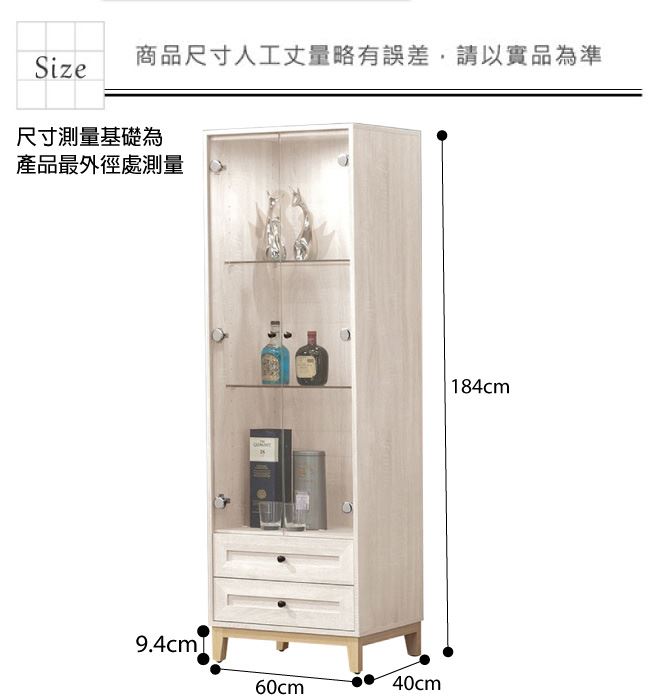 材質 | ◆產品名稱: 【綠家居】范辛頓 時尚2尺二門二抽展示櫃/收納櫃 尺寸:(寬)60x(深)40x(高)184/公分 ◆材質: 材質:防蛀木心板+防潮耐磨腳座+防夾手緩衝門片五金+五金滑軌結構+強化玻璃門片 噴漆:防潮耐磨噴漆處理