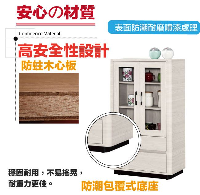 材質 | ◆產品名稱:【綠家居】巴卡莉2.3尺二門二抽展示櫃/收納櫃 尺寸:(寬)70x(深)40(高)120公分 ◆材質: 材質:防蛀木心板+防潮包覆式腳座+防夾手緩衝門片五金+五金滑軌結構 噴漆:防潮耐磨噴漆處理