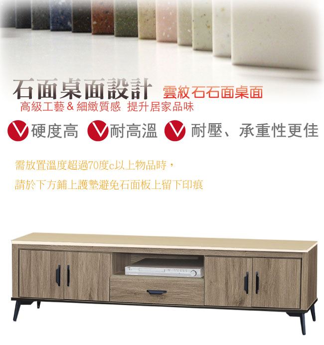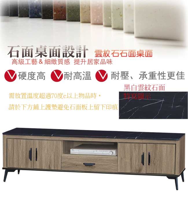 商品介紹 | 【綠家居】凱梅 四門7尺石面單抽電視櫃(二色石面可選) 灰橡木紋色系+二色石面可選+現代簡約風格+安心材質製造,整體採用防蛀木心板+黑鐵砂框架&腳座+五金滑軌結構+12mm雲紋石面板等安心材質製造,產品外層採用防潮耐磨噴漆處理搭配採用開門櫃+單抽屜+開放式層格收納等收納空間設計,全由專人配送到家,專業安心服務,替你省下更多時間! 【商品特色】 灰橡木紋色系+二色石面可選+現代簡約風格+安心材質製造,使用放心+搭配居家更便利 採用防蛀木心板+黑鐵砂框架&腳座+五金滑軌結構+12mm雲紋石面板等安心材質製造 產品外層採用防潮耐磨噴漆處理 搭配採用開門櫃+單抽屜+開放式層格收納等收納空間設計 此商品不需要DIY組立,此商品為組立後之成品 品質保證、專業設計、貼心服務 全由專人配送到家,專業安心服務,替您省下更多時間 |
