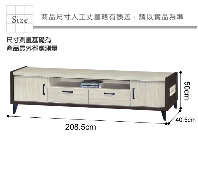 材質 | ◆產品名稱: 【綠家居】塞加 雙色7尺二門二抽電視櫃 尺寸:(寬)208.5x(深)40.5x(高)50/公分 ◆材質: 材質:防蛀木心板+防潮黑漆腳座+五金滑軌結構+防夾手緩衝門片五金 噴漆:防潮耐磨噴漆處理