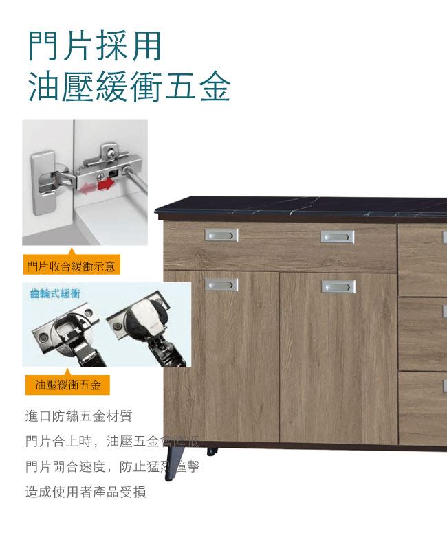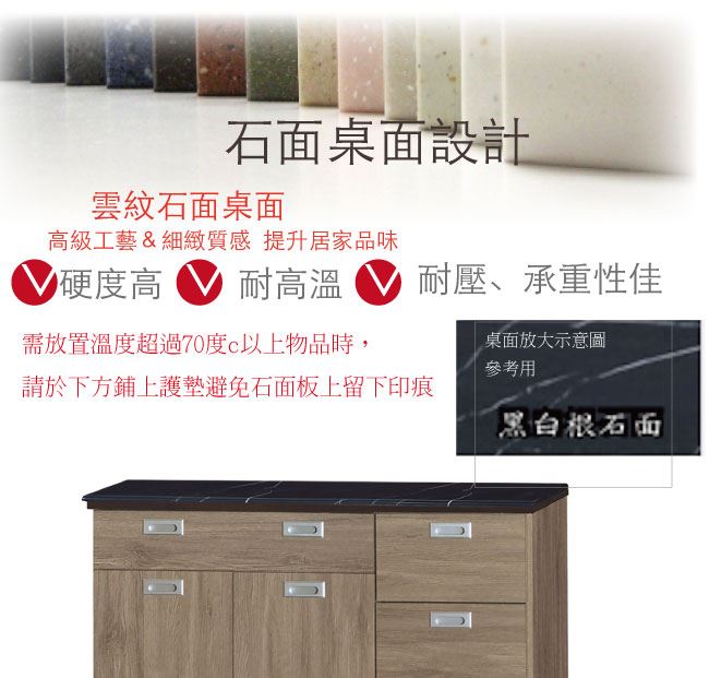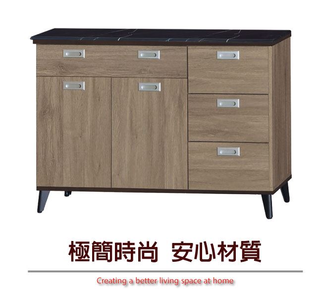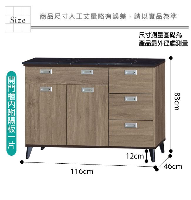 材質 | ◆產品名稱: 【綠家居】安貝斯 灰橡3.9尺黑白雲紋石面餐櫃 尺寸:(寬)116x(深)46x(高)83/公分 ◆材質: 材質:防蛀木心板+黑鐵砂腳座+五金滑軌結構+12mm黑白雲紋石面板+防夾手緩衝門片五金 噴漆:防潮耐磨噴漆處理