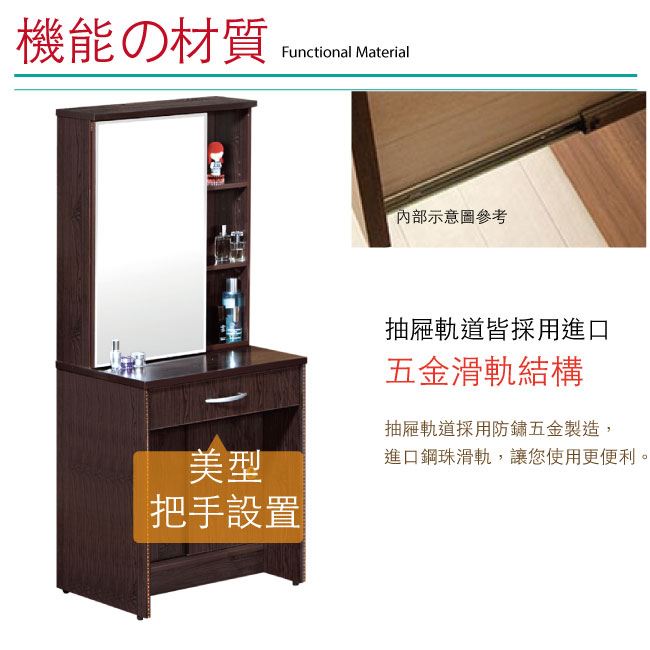 材質 | ◆產品名稱: 【綠家居】米斯利 環保2.2尺南亞塑鋼化妝台(不含化妝椅) 尺寸:(寬)66.6x(深)45x(高)155.9/公分 ◆材質: 主體:南亞塑鋼舒美板+強化玻璃鏡面 軌道:五金滑軌結構 |