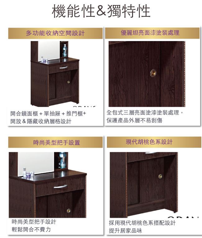商品介紹 | 【綠家居】米斯利 環保2.2尺南亞塑鋼化妝台(不含化妝椅) 產品採用第一品牌-台製南亞塑鋼舒美板+五金滑軌結構+強化玻璃鏡面等材質,整體材質採用防水+防燃+無甲醛安心塑鋼材質製造 ,搭配開合式鏡面櫃+推門櫃+單抽屜+開放式收納等便利設計,防止受潮,增加支撐力,堅固不會塌陷,全由專人配送到家,專業安心服務,替你省下更多時間! 【商品特色】 時尚雙色系設計+安心材質製造,使用放心+搭配居家更便利 搭配開合式鏡面櫃+推門櫃+單抽屜+開放式收納等便利設計 防水+防燃+無甲醛安心塑鋼材質,結構牢固耐用,也不用擔心蟲蛀的煩惱,使用放心 產品採用第一品牌-台製南亞塑鋼舒美板材質 此商品不需要DIY組立,此商品為組立後之成品 品質保證、專業設計、貼心服務 全由專人配送到家,專業安心服務,替你省下更多時間 請注意:本公司所販售南亞塑鋼產品為保障消費者權益及維護產品品質的考量,產品皆為接單後生產組裝(配送產品為已組裝完成之半成品),等待週期約10-14天工作天(不含實際配送日期等待天數),請您訂購前務必事先確認是否可以等待,避免引發不必要之消費爭議 ,如有不便之處請見諒! 請注意:本產品因接單後需提前組裝才出貨,外包裝並非裝箱處理,而是採用膠膜作為外包裝保護使用,產品本公司保證皆為全新產品,並非二手產品出貨,另外因塑鋼板材為亮面漆塗裝處理,板材本就容易受粉塵及搬運過程造成輕微刮傷,絕不會影響產品安全結構。 其中以胡桃色系產品因色彩互相對比關係,周邊如有輕微刮傷較稍微明顯,收到產品後如有週邊輕微小刮傷,在不影響產品正面外觀與美觀下,請多包涵並體諒能不吹毛求疵!我們也會做好相關售後服務!謝謝! |