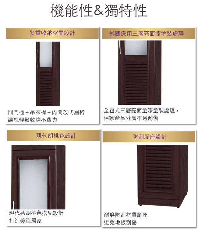 商品介紹 | 【綠家居】谷利 環保1.5尺南亞塑鋼單門百葉高衣櫃/收納櫃 產品採用第一品牌-台製南亞塑鋼舒美板+噴砂壓克力等材質,整體材質採用防水+防燃+無甲醛安心塑鋼材質製造 ,搭配開門櫃+吊衣桿+內開放式收納等便利設計,防止受潮,增加支撐力,堅固不會塌陷,全由專人配送到家,專業安心服務,替你省下更多時間! 【商品特色】 現代雙色系設計+安心材質製造,使用放心+搭配居家更便利 搭配開門櫃+吊衣桿+內開放式收納等便利設計 防水+防燃+無甲醛安心塑鋼材質,結構牢固耐用,也不用擔心蟲蛀的煩惱,使用放心 產品採用第一品牌-台製南亞塑鋼舒美板+噴砂壓克力等材質 此商品不需要DIY組立,此商品為組立後之成品 品質保證、專業設計、貼心服務 全由專人配送到家,專業安心服務,替你省下更多時間 請注意:本公司所販售南亞塑鋼產品為保障消費者權益及維護產品品質的考量,產品皆為接單後生產組裝(配送產品為已組裝完成之半成品),等待週期約10-14天工作天(不含實際配送日期等待天數),請您訂購前務必事先確認是否可以等待,避免引發不必要之消費爭議 ,如有不便之處請見諒! 請注意:本產品因接單後需提前組裝才出貨,外包裝並非裝箱處理,而是採用膠膜作為外包裝保護使用,產品本公司保證皆為全新產品,並非二手產品出貨,另外因塑鋼板材為亮面漆塗裝處理,板材本就容易受粉塵及搬運過程造成輕微刮傷,絕不會影響產品安全結構。 其中以胡桃色系產品因色彩互相對比關係,周邊如有輕微刮傷較稍微明顯,收到產品後如有週邊輕微小刮傷,在不影響產品正面外觀與美觀下,請多包涵並體諒能不吹毛求疵!我們也會做好相關售後服務!謝謝!