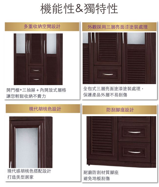 商品介紹 | 【綠家居】谷利 環保4.5尺南亞塑鋼三門百葉三抽高衣櫃/收納櫃 產品採用第一品牌-台製南亞塑鋼舒美板+噴砂壓克力+五金滑軌結構等材質,整體材質採用防水+防燃+無甲醛安心塑鋼材質製造 ,搭配開門櫃+吊衣桿+三抽屜+內開放式收納等便利設計,防止受潮,增加支撐力,堅固不會塌陷,全由專人配送到家,專業安心服務,替你省下更多時間! 【商品特色】 現代雙色系設計+安心材質製造,使用放心+搭配居家更便利 搭配開門櫃+吊衣桿+三抽屜+內開放式收納等便利設計 防水+防燃+無甲醛安心塑鋼材質,結構牢固耐用,也不用擔心蟲蛀的煩惱,使用放心 產品採用第一品牌-台製南亞塑鋼舒美板+噴砂壓克力+五金滑軌結構等材質 此商品不需要DIY組立,此商品為組立後之成品 品質保證、專業設計、貼心服務 全由專人配送到家,專業安心服務,替你省下更多時間 請注意:本公司所販售南亞塑鋼產品為保障消費者權益及維護產品品質的考量,產品皆為接單後生產組裝(配送產品為已組裝完成之半成品),等待週期約10-14天工作天(不含實際配送日期等待天數),請您訂購前務必事先確認是否可以等待,避免引發不必要之消費爭議 ,如有不便之處請見諒! 請注意:本產品因接單後需提前組裝才出貨,外包裝並非裝箱處理,而是採用膠膜作為外包裝保護使用,產品本公司保證皆為全新產品,並非二手產品出貨,另外因塑鋼板材為亮面漆塗裝處理,板材本就容易受粉塵及搬運過程造成輕微刮傷,絕不會影響產品安全結構。 其中以胡桃色系產品因色彩互相對比關係,周邊如有輕微刮傷較稍微明顯,收到產品後如有週邊輕微小刮傷,在不影響產品正面外觀與美觀下,請多包涵並體諒能不吹毛求疵!我們也會做好相關售後服務!謝謝! |