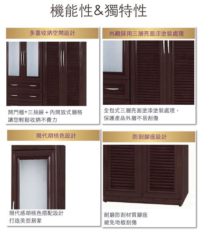 商品介紹 | 【綠家居】谷利 環保6.1尺南亞塑鋼四門百葉三抽高衣櫃/收納櫃 產品採用第一品牌-台製南亞塑鋼舒美板+噴砂壓克力+五金滑軌結構等材質,整體材質採用防水+防燃+無甲醛安心塑鋼材質製造 ,搭配開門櫃+吊衣桿+三抽屜+內開放式收納等便利設計,防止受潮,增加支撐力,堅固不會塌陷,全由專人配送到家,專業安心服務,替你省下更多時間! 【商品特色】 現代雙色系設計+安心材質製造,使用放心+搭配居家更便利 搭配開門櫃+吊衣桿+三抽屜+內開放式收納等便利設計 防水+防燃+無甲醛安心塑鋼材質,結構牢固耐用,也不用擔心蟲蛀的煩惱,使用放心 產品採用第一品牌-台製南亞塑鋼舒美板+噴砂壓克力+五金滑軌結構等材質 此商品不需要DIY組立,此商品為組立後之成品 品質保證、專業設計、貼心服務 全由專人配送到家,專業安心服務,替你省下更多時間 請注意:本公司所販售南亞塑鋼產品為保障消費者權益及維護產品品質的考量,產品皆為接單後生產組裝(配送產品為已組裝完成之半成品),等待週期約10-14天工作天(不含實際配送日期等待天數),請您訂購前務必事先確認是否可以等待,避免引發不必要之消費爭議 ,如有不便之處請見諒! 請注意:本產品因接單後需提前組裝才出貨,外包裝並非裝箱處理,而是採用膠膜作為外包裝保護使用,產品本公司保證皆為全新產品,並非二手產品出貨,另外因塑鋼板材為亮面漆塗裝處理,板材本就容易受粉塵及搬運過程造成輕微刮傷,絕不會影響產品安全結構。 其中以胡桃色系產品因色彩互相對比關係,周邊如有輕微刮傷較稍微明顯,收到產品後如有週邊輕微小刮傷,在不影響產品正面外觀與美觀下,請多包涵並體諒能不吹毛求疵!我們也會做好相關售後服務!謝謝! |