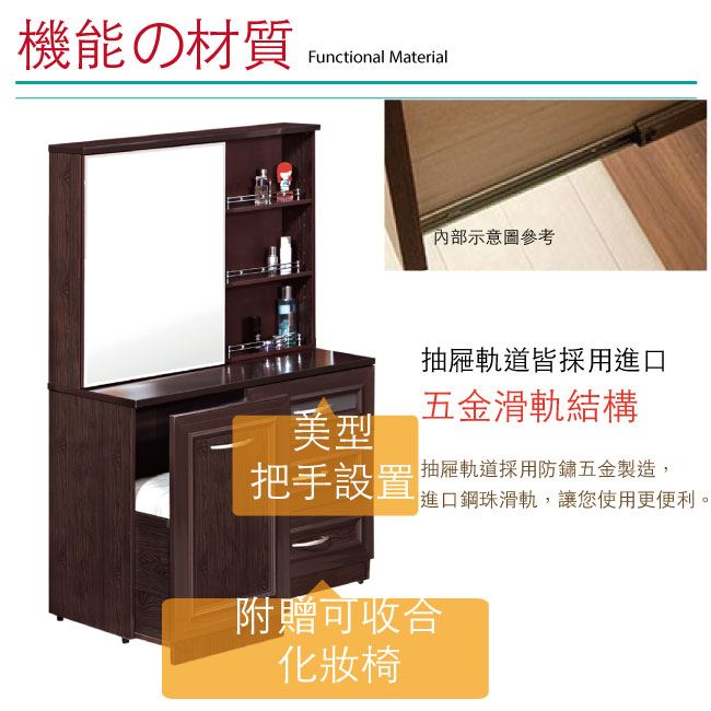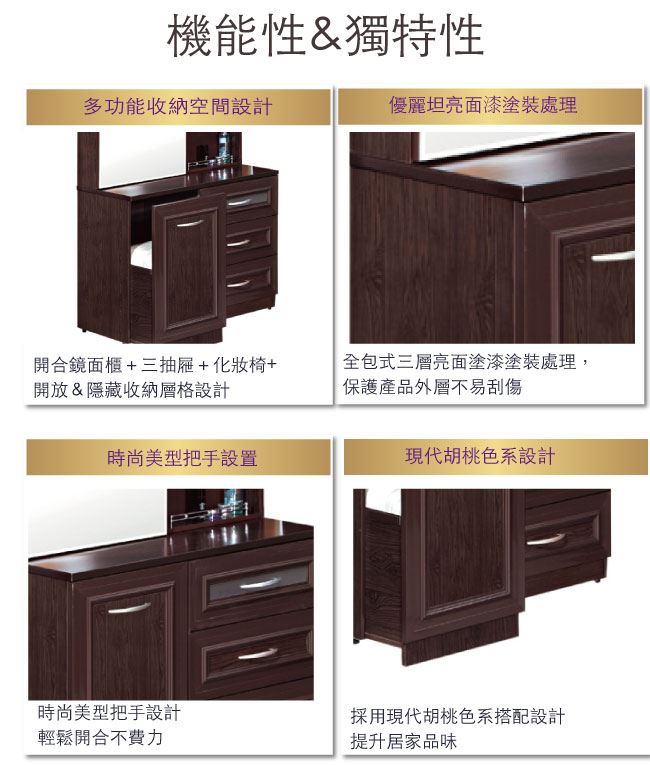 商品介紹 | 【綠家居】海利 環保3.5尺南亞塑鋼化妝台組合(含化妝椅) 產品採用第一品牌-台製南亞塑鋼舒美板+五金滑軌結構+強化玻璃鏡面等材質,整體材質採用防水+防燃+無甲醛安心塑鋼材質製造 ,搭配開合式鏡面櫃+開門櫃+三抽屜+開放式收納+可收納化妝椅等便利設計,防止受潮,增加支撐力,堅固不會塌陷,全由專人配送到家,專業安心服務,替你省下更多時間! 【商品特色】 胡桃色系設計+安心材質製造,使用放心+搭配居家更便利 搭配開合式鏡面櫃+開門櫃+三抽屜+開放式收納+可收納化妝椅等便利設計 防水+防燃+無甲醛安心塑鋼材質,結構牢固耐用,也不用擔心蟲蛀的煩惱,使用放心 產品採用第一品牌-台製南亞塑鋼舒美板材質 此商品不需要DIY組立,此商品為組立後之成品 品質保證、專業設計、貼心服務 全由專人配送到家,專業安心服務,替你省下更多時間 請注意:本公司所販售南亞塑鋼產品為保障消費者權益及維護產品品質的考量,產品皆為接單後生產組裝(配送產品為已組裝完成之半成品),等待週期約10-14天工作天(不含實際配送日期等待天數),請您訂購前務必事先確認是否可以等待,避免引發不必要之消費爭議 ,如有不便之處請見諒! 請注意:本產品因接單後需提前組裝才出貨,外包裝並非裝箱處理,而是採用膠膜作為外包裝保護使用,產品本公司保證皆為全新產品,並非二手產品出貨,另外因塑鋼板材為亮面漆塗裝處理,板材本就容易受粉塵及搬運過程造成輕微刮傷,絕不會影響產品安全結構。 其中以胡桃色系產品因色彩互相對比關係,周邊如有輕微刮傷較稍微明顯,收到產品後如有週邊輕微小刮傷,在不影響產品正面外觀與美觀下,請多包涵並體諒能不吹毛求疵!我們也會做好相關售後服務!謝謝! |