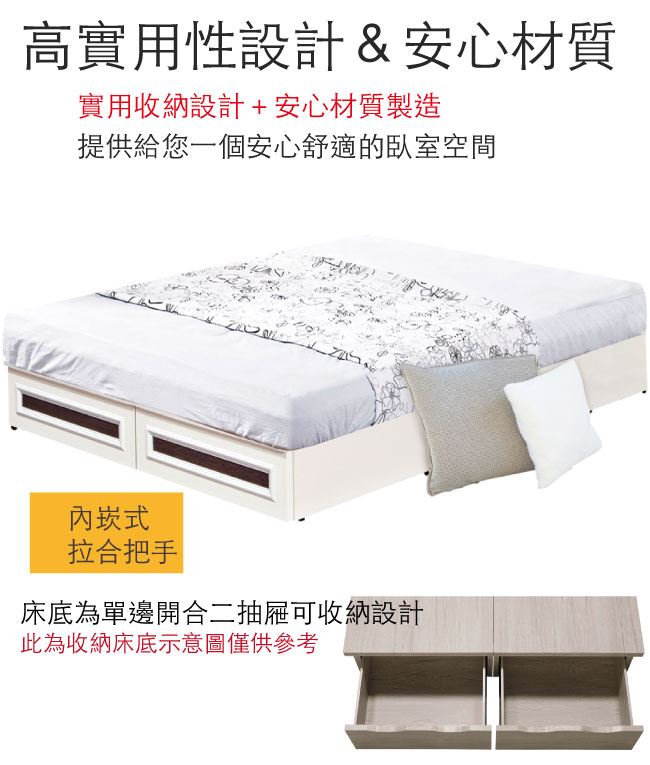 品介紹 | 【綠家居】凱菲 環保5尺雙人南亞塑鋼二抽屜床底(床尾開合二抽屜設置) 產品採用第一品牌-台製南亞塑鋼舒美板材質,整體材質採用防水+防燃+無甲醛安心塑鋼材質製造 ,搭配床底為床尾開合二抽屜收納設計,防止受潮,增加支撐力,堅固不會塌陷,全由專人配送到家,專業安心服務,替你省下更多時間! 【商品特色】 時尚雙色系設計+安心材質製造,使用放心+搭配居家更便利 搭配床底為床尾開合二抽屜收納設計 防水+防燃+無甲醛安心塑鋼材質,結構牢固耐用,也不用擔心蟲蛀的煩惱,使用放心 產品採用第一品牌-台製南亞塑鋼舒美板材質 此商品不需要DIY組立,此商品為組立後之成品 品質保證、專業設計、貼心服務 全由專人配送到家,專業安心服務,替你省下更多時間 請注意:本公司所販售南亞塑鋼產品為保障消費者權益及維護產品品質的考量,產品皆為接單後生產組裝(配送產品為已組裝完成之半成品),等待週期約10-14天工作天(不含實際配送日期等待天數),請您訂購前務必事先確認是否可以等待,避免引發不必要之消費爭議 ,如有不便之處請見諒! 請注意:本產品因接單後需提前組裝才出貨,外包裝並非裝箱處理,而是採用膠膜作為外包裝保護使用,產品本公司保證皆為全新產品,並非二手產品出貨,另外因塑鋼板材為亮面漆塗裝處理,板材本就容易受粉塵及搬運過程造成輕微刮傷,絕不會影響產品安全結構。 其中以胡桃色系產品因色彩互相對比關係,周邊如有輕微刮傷較稍微明顯,收到產品後如有週邊輕微小刮傷,在不影響產品正面外觀與美觀下,請多包涵並體諒能不吹毛求疵!我們也會做好相關售後服務!謝謝! |