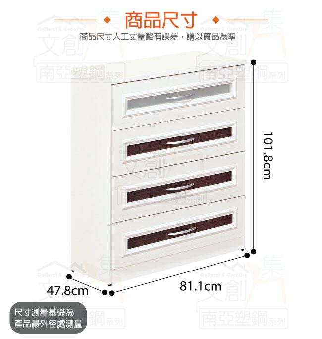 商品介紹 | 【綠家居】凱菲 環保2.7尺南亞塑鋼四斗櫃/收納櫃 產品採用第一品牌-台製南亞塑鋼舒美板+五金滑軌結構+中空發泡板+噴砂壓克力等材質,整體材質採用防水+防燃+無甲醛安心塑鋼材質製造 ,搭配四抽屜+開放式收納等便利設計,防止受潮,增加支撐力,堅固不會塌陷,全由專人配送到家,專業安心服務,替你省下更多時間! 【商品特色】 時尚雙色系設計+安心材質製造,使用放心+搭配居家更便利 搭配四抽屜+開放式收納等便利設計 防水+防燃+無甲醛安心塑鋼材質,結構牢固耐用,也不用擔心蟲蛀的煩惱,使用放心 產品採用第一品牌-台製南亞塑鋼舒美板+中空發泡板+噴砂壓克力材質 此商品不需要DIY組立,此商品為組立後之成品 品質保證、專業設計、貼心服務 全由專人配送到家,專業安心服務,替你省下更多時間 請注意:本公司所販售南亞塑鋼產品為保障消費者權益及維護產品品質的考量,產品皆為接單後生產組裝(配送產品為已組裝完成之半成品),等待週期約10-14天工作天(不含實際配送日期等待天數),請您訂購前務必事先確認是否可以等待,避免引發不必要之消費爭議 ,如有不便之處請見諒! 請注意:本產品因接單後需提前組裝才出貨,外包裝並非裝箱處理,而是採用膠膜作為外包裝保護使用,產品本公司保證皆為全新產品,並非二手產品出貨,另外因塑鋼板材為亮面漆塗裝處理,板材本就容易受粉塵及搬運過程造成輕微刮傷,絕不會影響產品安全結構。 其中以胡桃色系產品因色彩互相對比關係,周邊如有輕微刮傷較稍微明顯,收到產品後如有週邊輕微小刮傷,在不影響產品正面外觀與美觀下,請多包涵並體諒能不吹毛求疵!我們也會做好相關售後服務!謝謝! |