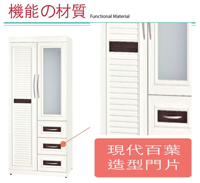 材質 | ◆產品名稱: 【綠家居】凱菲 環保3尺南亞塑鋼百葉開門三抽高衣櫃/收納櫃 尺寸:(寬)90.8x(深)60.4x(高)200/公分 ◆材質: 主體:南亞塑鋼舒美板+噴砂壓克力 軌道:五金滑軌結構 |