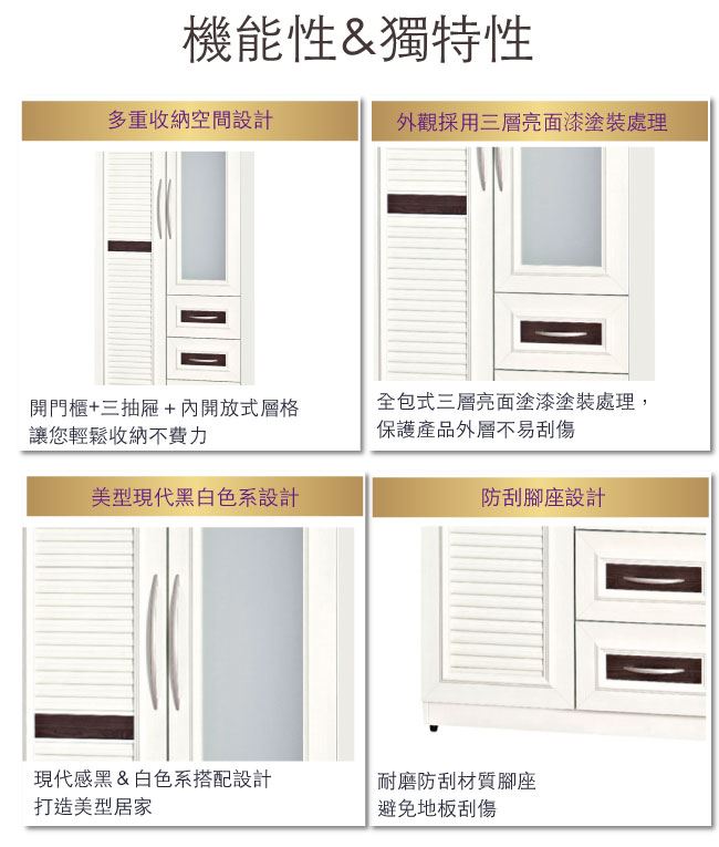 商品介紹 | 【綠家居】凱菲 環保3尺南亞塑鋼百葉開門三抽高衣櫃/收納櫃 產品採用第一品牌-台製南亞塑鋼舒美板+五金滑軌結構+噴砂壓克力等材質,整體材質採用防水+防燃+無甲醛安心塑鋼材質製造 ,搭配開門櫃+吊衣桿+三抽屜+內開放式收納等便利設計,防止受潮,增加支撐力,堅固不會塌陷,全由專人配送到家,專業安心服務,替你省下更多時間! 【商品特色】 現代雙色系設計+安心材質製造,使用放心+搭配居家更便利 搭配開門櫃+吊衣桿+三抽屜+內開放式收納等便利設計 防水+防燃+無甲醛安心塑鋼材質,結構牢固耐用,也不用擔心蟲蛀的煩惱,使用放心 產品採用第一品牌-台製南亞塑鋼舒美板+五金滑軌結構+噴砂壓克力等材質 此商品不需要DIY組立,此商品為組立後之成品 品質保證、專業設計、貼心服務 全由專人配送到家,專業安心服務,替你省下更多時間 請注意:本公司所販售南亞塑鋼產品為保障消費者權益及維護產品品質的考量,產品皆為接單後生產組裝(配送產品為已組裝完成之半成品),等待週期約10-14天工作天(不含實際配送日期等待天數),請您訂購前務必事先確認是否可以等待,避免引發不必要之消費爭議 ,如有不便之處請見諒! 請注意:本產品因接單後需提前組裝才出貨,外包裝並非裝箱處理,而是採用膠膜作為外包裝保護使用,產品本公司保證皆為全新產品,並非二手產品出貨,另外因塑鋼板材為亮面漆塗裝處理,板材本就容易受粉塵及搬運過程造成輕微刮傷,絕不會影響產品安全結構。 其中以胡桃色系產品因色彩互相對比關係,周邊如有輕微刮傷較稍微明顯,收到產品後如有週邊輕微小刮傷,在不影響產品正面外觀與美觀下,請多包涵並體諒能不吹毛求疵!我們也會做好相關售後服務!謝謝! |
