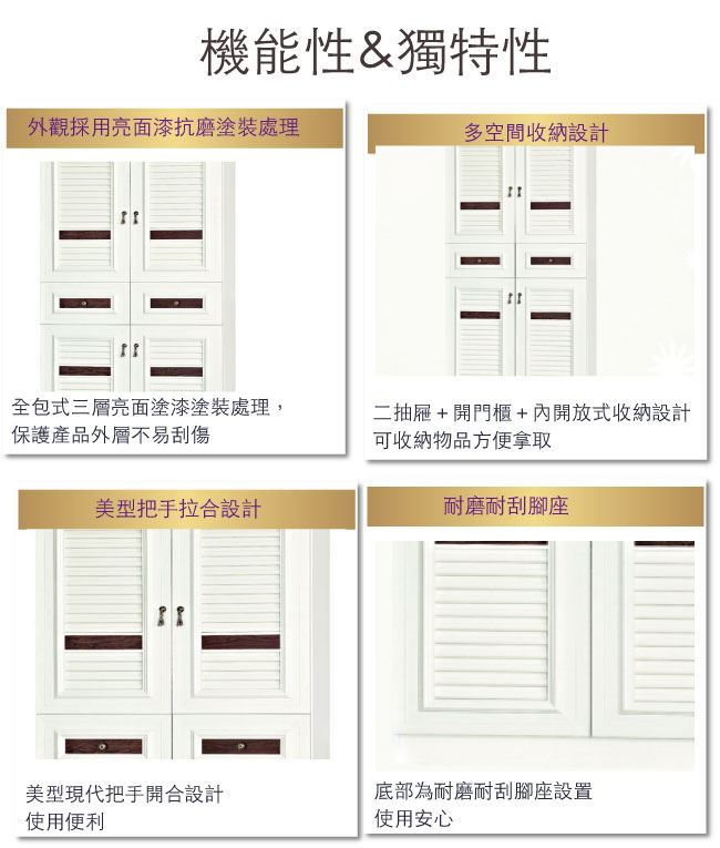 商品介紹 | 【綠家居】麥納 環保2.7尺南亞塑鋼四門二抽高鞋櫃 產品採用第一品牌-台製南亞塑鋼舒美板+五金滑軌結構材質,整體材質採用防水+防燃+無甲醛安心塑鋼材質製造 ,搭配開門櫃+二抽屜+內開放式多層格等便利收納空間設計,防止受潮,增加支撐力,堅固不會塌陷,全由專人配送到家,專業安心服務,替你省下更多時間! 【商品特色】 時尚木紋色系設計+安心材質製造,使用放心+搭配居家更便利 開門櫃+二抽屜+內開放式多層格等便利收納空間設計 防水+防燃+無甲醛安心塑鋼材質,結構牢固耐用,也不用擔心蟲蛀的煩惱,使用放心 產品採用第一品牌-台製南亞塑鋼舒美板+五金滑軌結構等材質 此商品不需要DIY組立,此商品為組立後之成品 品質保證、專業設計、貼心服務 全由專人配送到家,專業安心服務,替你省下更多時間 請注意:本公司所販售南亞塑鋼產品為保障消費者權益及維護產品品質的考量,產品皆為接單後生產組裝(配送產品為已組裝完成之半成品),等待週期約10-14天工作天(不含實際配送日期等待天數),請您訂購前務必事先確認是否可以等待,避免引發不必要之消費爭議 ,如有不便之處請見諒! 請注意:本產品因接單後需提前組裝才出貨,外包裝並非裝箱處理,而是採用膠膜作為外包裝保護使用,產品本公司保證皆為全新產品,並非二手產品出貨,另外因塑鋼板材為亮面漆塗裝處理,板材本就容易受粉塵及搬運過程造成輕微刮傷,絕不會影響產品安全結構。 其中以胡桃色系產品因色彩互相對比關係,周邊如有輕微刮傷較稍微明顯,收到產品後如有週邊輕微小刮傷,在不影響產品正面外觀與美觀下,請多包涵並體諒能不吹毛求疵!我們也會做好相關售後服務!謝謝! |