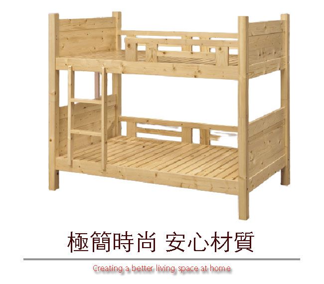 商品 介紹 | 【綠家居】康羅斯 松木紋3.5尺單人實木雙層床台組合 松木紋色+現代簡約風格+安心材質製造,整體採用松木實木+實木床板+防潮實木底座等安心材質製造,外層採用優利坦全包式耐磨噴漆處理搭配側邊安全護欄+便利上下樓梯安全防護設計,全由專人配送到家,專業安心服務,替你省下更多時間! 【商品特色】 松木紋色+現代簡約風格+安心材質製造,使用放心+搭配居家更便利 採用松木實木+實木床板+防潮實木底座等安心材質製造 搭配側邊安全護欄+便利上下樓梯安全防護設計 此商品不需要DIY組立,此商品為組立後之成品 品質保證、專業設計、貼心服務 全由專人配送到家,專業安心服務,替您省下更多時間 |