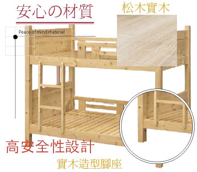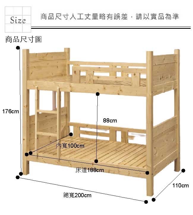產品名稱:【綠家居】康羅斯 松木紋3.5尺單人實木雙層床台組合 產品尺寸: 床台尺寸:(寬)110(深)200x(高)176/公分 ◆材質: 材質:松木實木+實木床板+防潮實木底座 塗漆:優利坦全包式耐磨噴漆處理