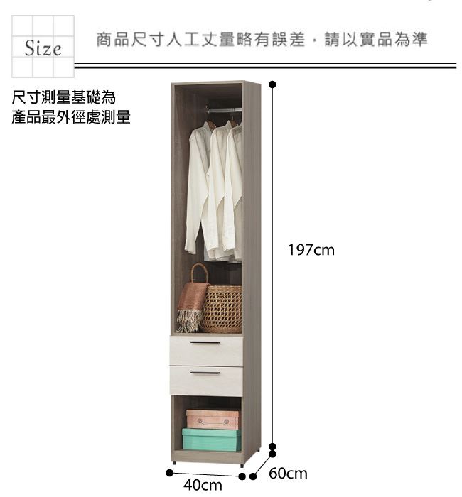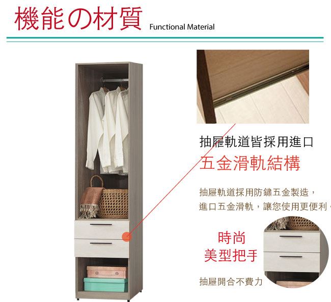 材質 | ◆產品名稱: 【綠家居】歐倫勒 雙色1.3尺二抽開放式衣櫃/收納櫃 尺寸:(寬)40x(深)60x(高)197公分 ◆材質: 材質:防蛀木心板+防潮耐磨腳座+五金滑軌結構 外層採用全包式防潮耐磨噴漆處理