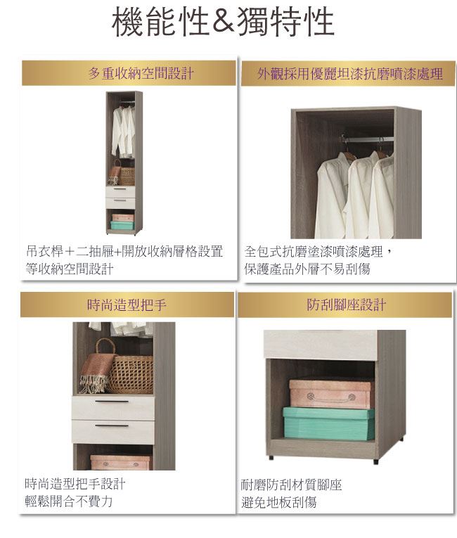 商品介紹 | 【綠家居】歐倫勒 雙色1.3尺二抽開放式衣櫃/收納櫃 橡木紋雙色系+現代簡約風格+安心材質製造,整體採用防蛀木心板+防潮耐磨腳座+五金滑軌結構等安心材質製造,外層採用全包式防潮耐磨噴漆處理搭配採用吊衣桿+二抽屜+開放式收納層格等收納空間設計,全由專人配送到家,專業安心服務,替你省下更多時間! 【商品特色】 橡木紋雙色系+現代簡約風格+安心材質製造,使用放心+搭配居家更便利 採用防蛀木心板+防潮耐磨腳座+五金滑軌結構等安心材質製造 採用吊衣桿+二抽屜+開放式收納層格等收納空間設計 此商品不需要DIY組立,此商品為組立後之成品 品質保證、專業設計、貼心服務 全由專人配送到家,專業安心服務,替您省下更多時間 |