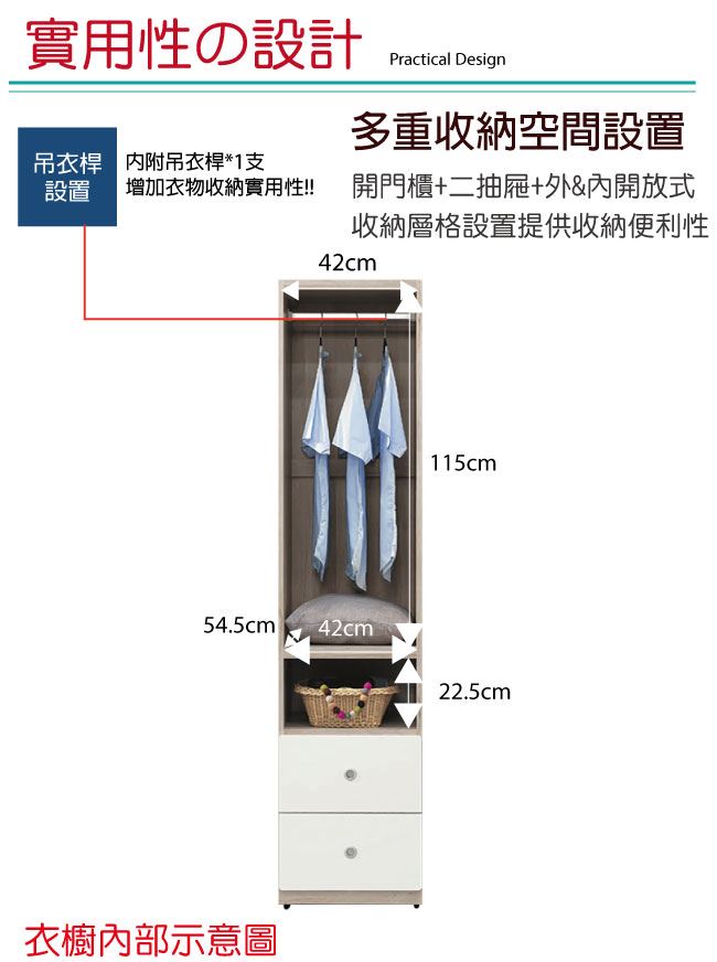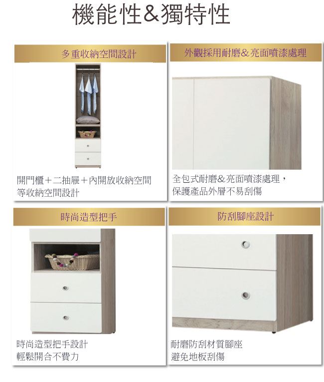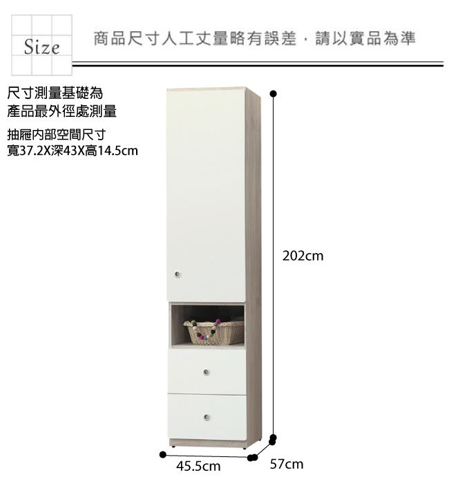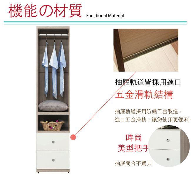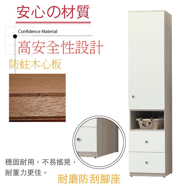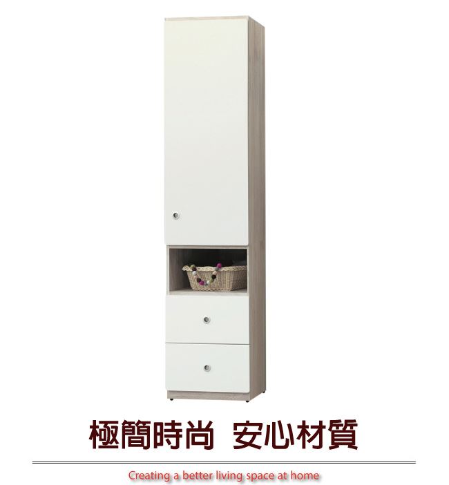 材質 | ◆產品名稱: 【綠家居】歐妮絲 時尚1.5尺單門二抽衣櫃/收納櫃 尺寸:(寬)45.5x(深)57x(高)202公分 ◆材質: 材質:防蛀木心板+防潮耐磨腳座+五金滑軌結構 外層採用全包式防潮耐磨噴漆處理