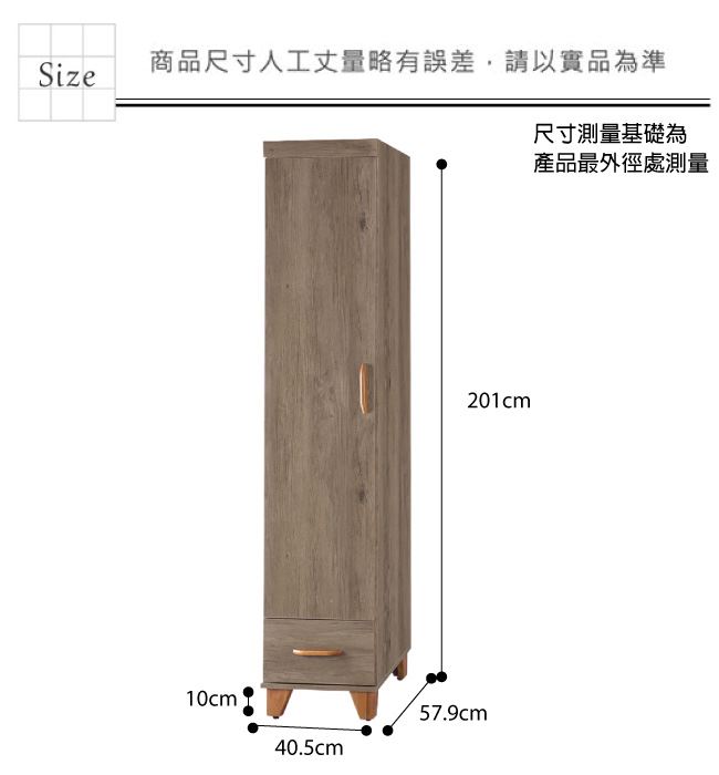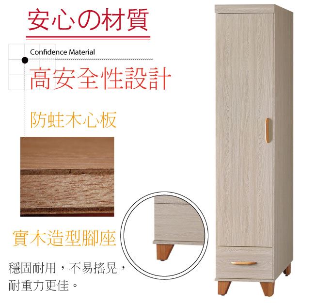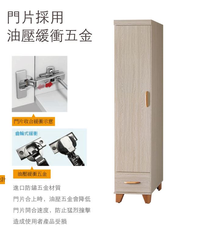 材質 | ◆產品名稱: 【綠家居】法尼莫 時尚1.3尺單門單抽衣櫃/收納櫃(二色可選) 尺寸:(寬)40.5x(深)57.9x(高)201公分 ◆材質: 材質:防蛀木心板+防潮實木腳座+五金滑軌結構+防夾手緩衝門片五金 外層採用全包式防潮耐磨噴漆處理