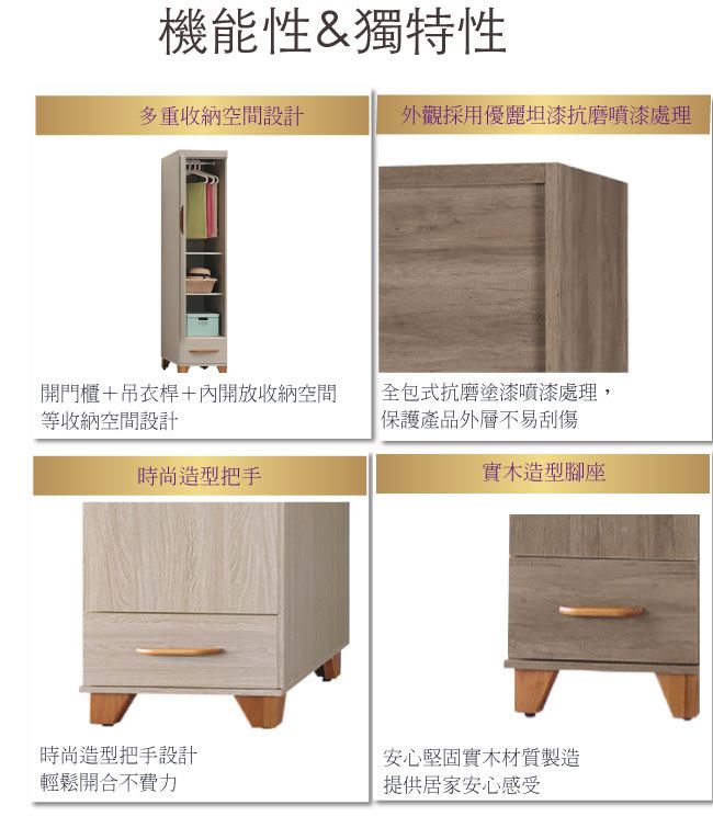 商品介紹 | 【綠家居】法尼莫 時尚1.3尺單門單抽衣櫃/收納櫃(二色可選) 木紋雙色系+現代簡約風格+安心材質製造,整體採用防蛀木心板+防潮實木腳座+五金滑軌結構+防夾手緩衝門片五金等安心材質製造,外層採用全包式防潮耐磨噴漆處理搭配採用開門櫃+吊衣桿+單抽屜+內開放式收納層格等收納空間設計,全由專人配送到家,專業安心服務,替你省下更多時間! 【商品特色】 木紋雙色系+現代簡約風格+安心材質製造,使用放心+搭配居家更便利 採用防蛀木心板+防潮實木腳座+五金滑軌結構+防夾手緩衝門片五金等安心材質製造 採用開門櫃+吊衣桿+單抽屜+內開放式收納層格等收納空間設計 此商品不需要DIY組立,此商品為組立後之成品 品質保證、專業設計、貼心服務 全由專人配送到家,專業安心服務,替您省下更多時間 |