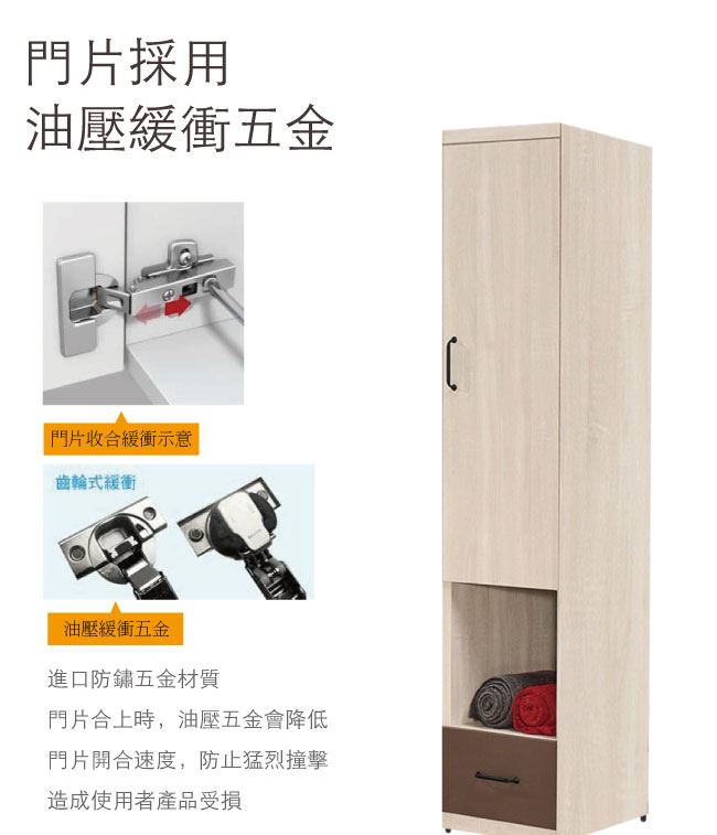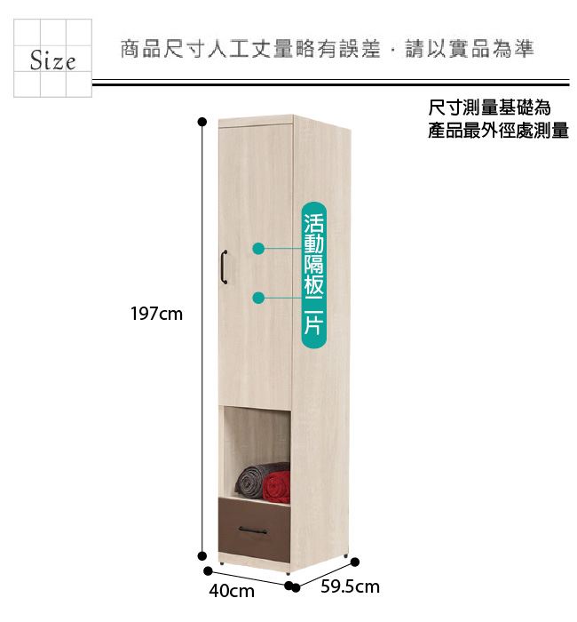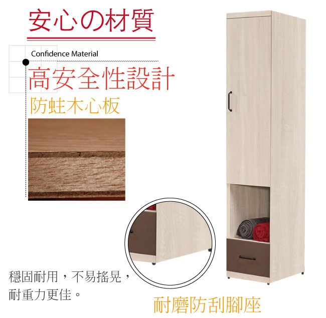 材質 | ◆產品名稱: 【綠家居】畢娜 雙色中空1.3尺單門單抽衣櫃 產品尺寸: 尺寸:(寬)40x(深)59.5x(高)197/公分 ◆材質: 材質:防蛀木心板+防潮耐磨腳座 材質:防夾手緩衝門片五金+五金滑軌結構 塗漆:優利坦全包式耐磨噴漆處理