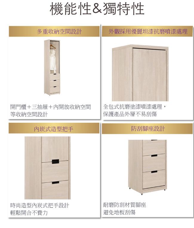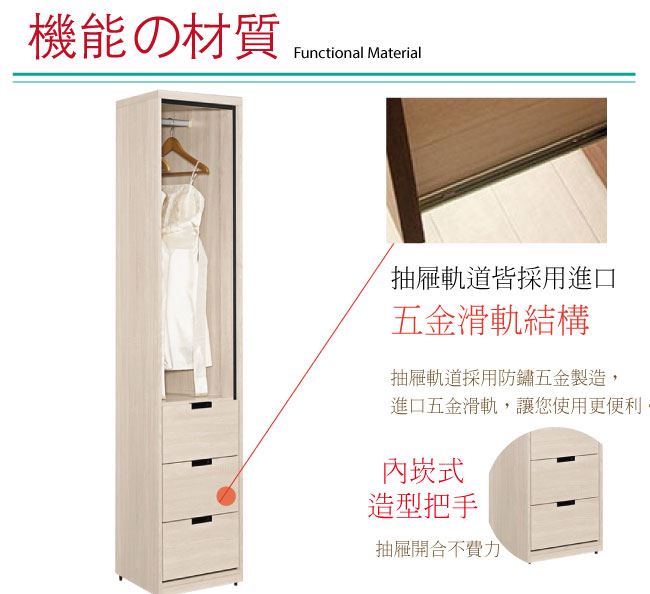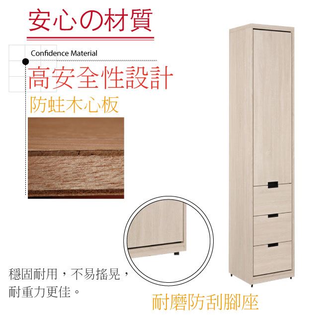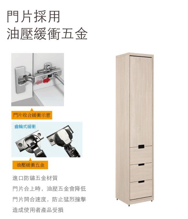 材質 | ◆產品名稱: 【綠家居】迪哈莉 橡木紋1.5尺單門三抽衣櫃 產品尺寸: 尺寸:(寬)45x(深)55x(高)202/公分 ◆材質: 材質:防蛀木心板+防潮耐磨腳座 材質:防夾手緩衝門片五金+五金滑軌結構 塗漆:優利坦全包式耐磨噴漆處理