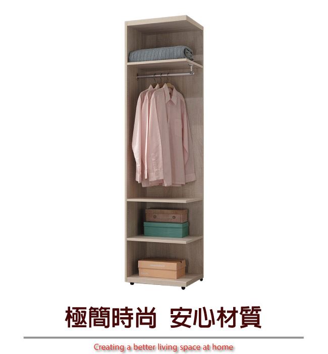 商品 介紹 | 【綠家居】維肯 時尚1.5尺開放式衣櫃/收納櫃 淺橡木紋色系+現代簡約風格+安心材質製造,整體採用防蛀木心板+防潮耐磨腳座等安心材質製造,搭配採用吊衣桿+開放式層格等收納空間設計,全由專人配送到家,專業安心服務,替你省下更多時間! 【商品特色】 淺橡木紋色+現代簡約風格+安心材質製造,使用放心+搭配居家更便利 採用防蛀木心板+防潮耐磨腳座等安心材質製造 採用吊衣桿+開放式層格等收納空間設計 此商品不需要DIY組立,此商品為組立後之成品 品質保證、專業設計、貼心服務 全由專人配送到家,專業安心服務,替您省下更多時間 |