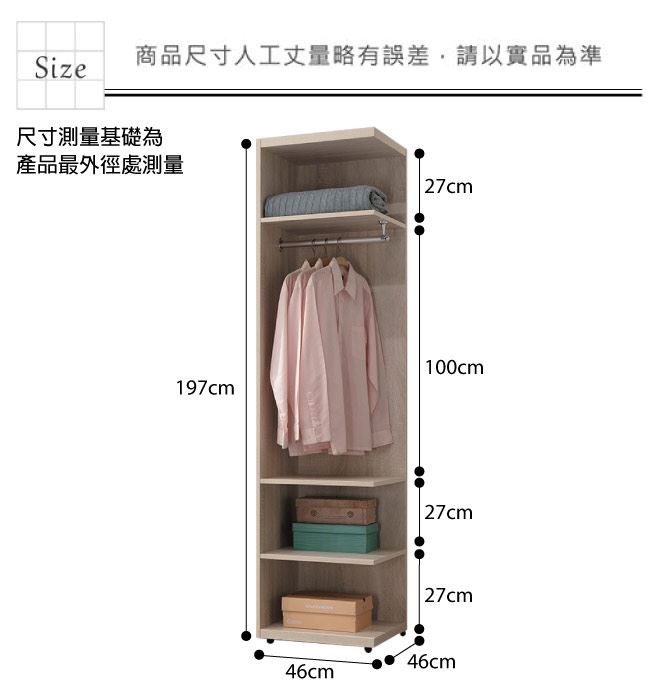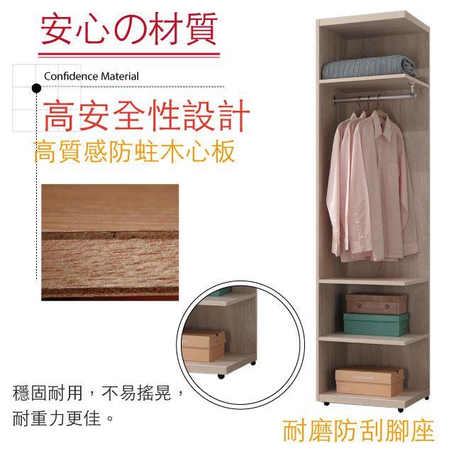 材質 | ◆產品名稱: 【綠家居】維肯 時尚1.5尺開放式衣櫃/收納櫃 尺寸:(寬)46x(深)46x(高)197/公分 ◆材質: 材質:防蛀木心板+防潮耐磨腳座 噴漆:外層採用防潮耐磨噴漆處理