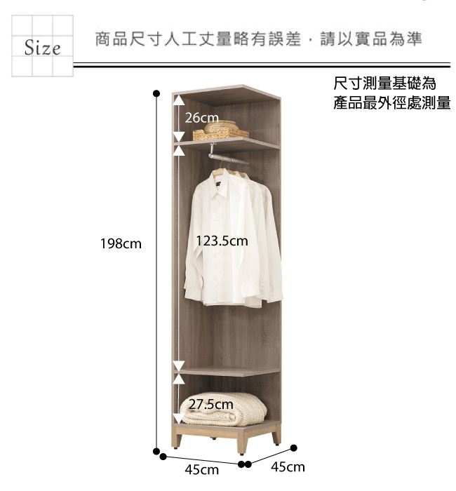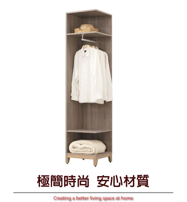 材質 | ◆產品名稱: 【綠家居】查德 時尚1.5尺開放式側邊衣櫃(二色可選) 產品尺寸: 尺寸:(寬)45x(深)45x(高)198/公分 ◆材質: 材質:防蛀木心板+防潮耐磨腳座 塗漆:優利坦全包式耐磨噴漆處理