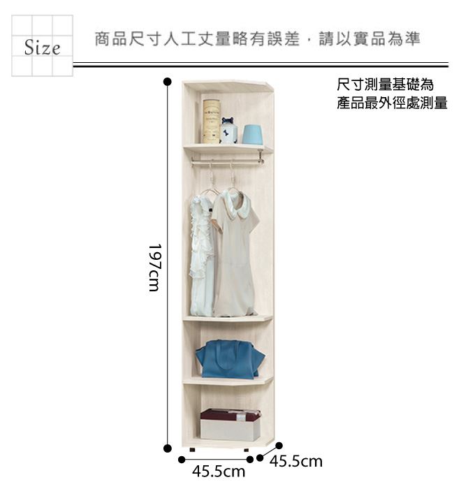 尺寸:(寬)45.5x(深)45.5(高)197/公分 ◆材質: 材質:防蛀木心板+防潮耐磨腳座 噴漆:防潮耐磨噴漆處理