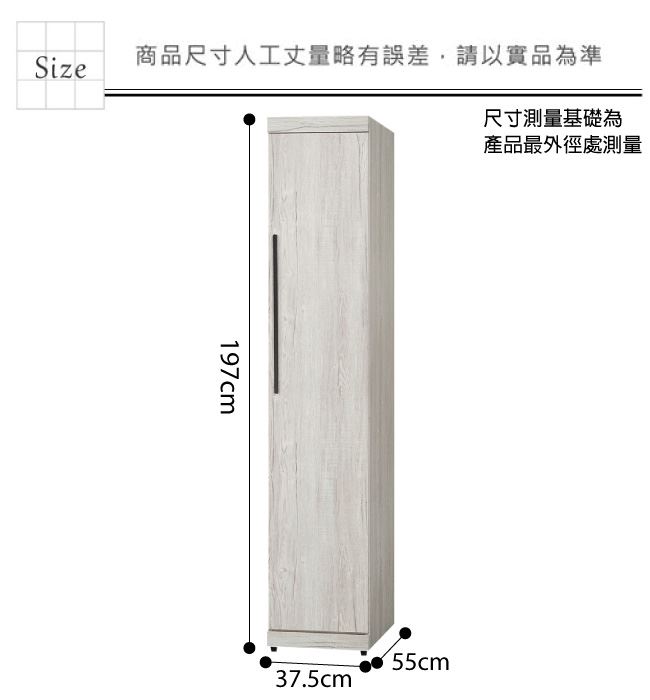 尺寸:(寬)37.5x(深)55(高)197公分 ◆材質: 材質:防蛀木心板+防潮耐磨腳座+防夾手緩衝門片五金 噴漆:防潮耐磨噴漆處理
