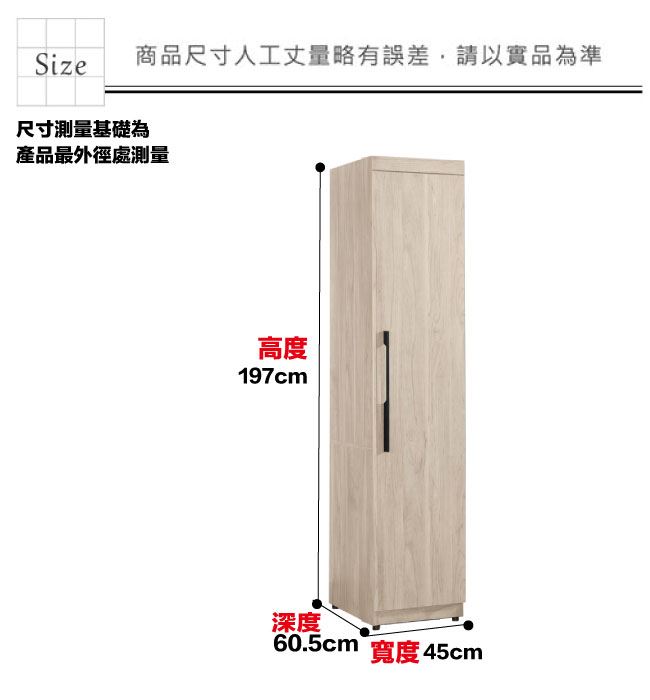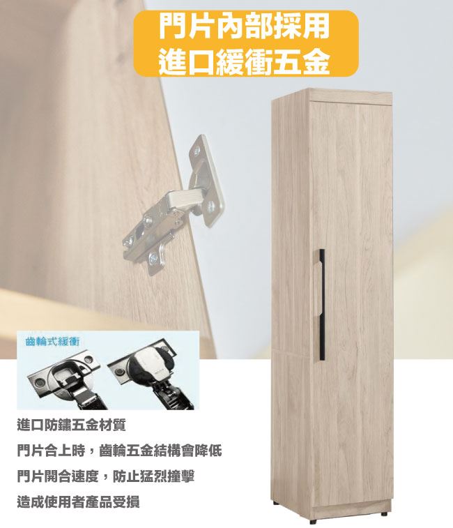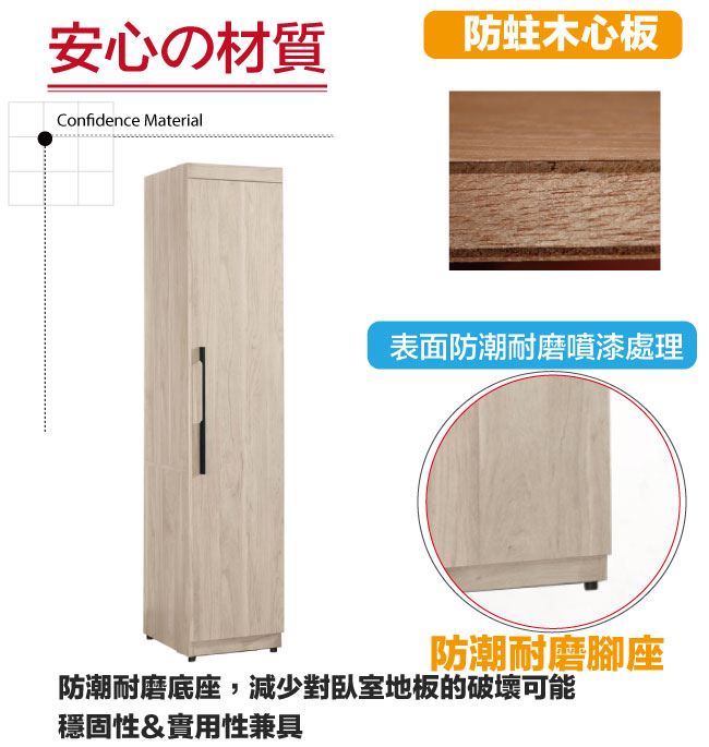 材質 | ◆產品名稱:【綠家居】比克坡1.5尺單門單吊衣櫃/收納櫃(左&右二向開門方向可選) 尺寸:(寬)45(深)60.5(高)197公分 ◆材質: 材質:防蛀木心板+防潮耐磨腳座+防夾手緩衝門片五金 噴漆:防潮耐磨噴漆處理
