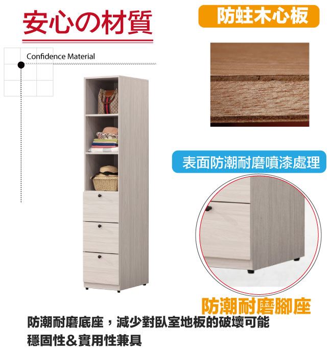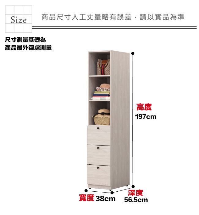 材質 | ◆產品名稱:【綠家居】布金1.3尺半開放三抽衣櫃/收納櫃 尺寸:(寬)38(深)56.5(高)197公分 ◆材質: 材質:防蛀木心板+防潮耐磨腳座+五金滑軌結構 噴漆:防潮耐磨噴漆處理