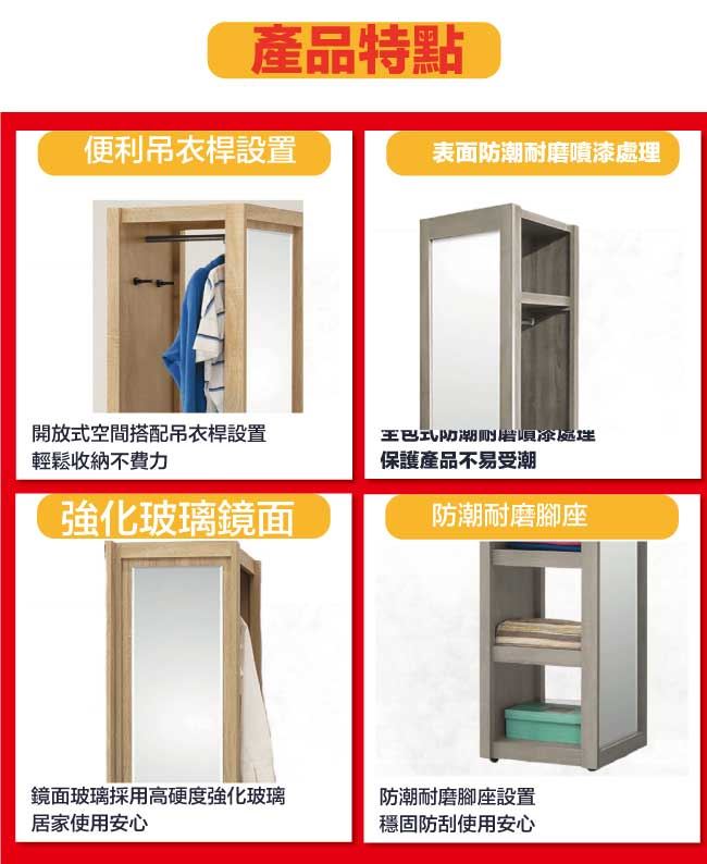商 品 介 紹 | 【綠家居】邁克可1.3尺全身鏡面側邊衣櫃/收納櫃(二色可選) 二色可選+現代簡約風格+安心材質製造,使用放心+搭配居家更便利,整體採用防蛀木心板+防潮耐磨腳座+強化玻璃鏡面等材質搭配外層採用優莉坦耐磨全包式噴漆處理 ,採用全身鏡面櫃+吊衣桿+開放式空間等收納空間設計,全由專人配送到家,專業安心服務,替你省下更多時間! 【商品特色】 二色可選+現代簡約風格+安心材質製造,使用放心+搭配居家更便利 防蛀木心板+防潮耐磨腳座+強化玻璃鏡面等材質 採用全身鏡面櫃+吊衣桿+開放式空間等收納空間設計 此商品不需要DIY組立,此商品為組立後之成品 品質保證、專業設計、貼心服務 全由專人配送到家,專業安心服務,替您省下更多時間 |