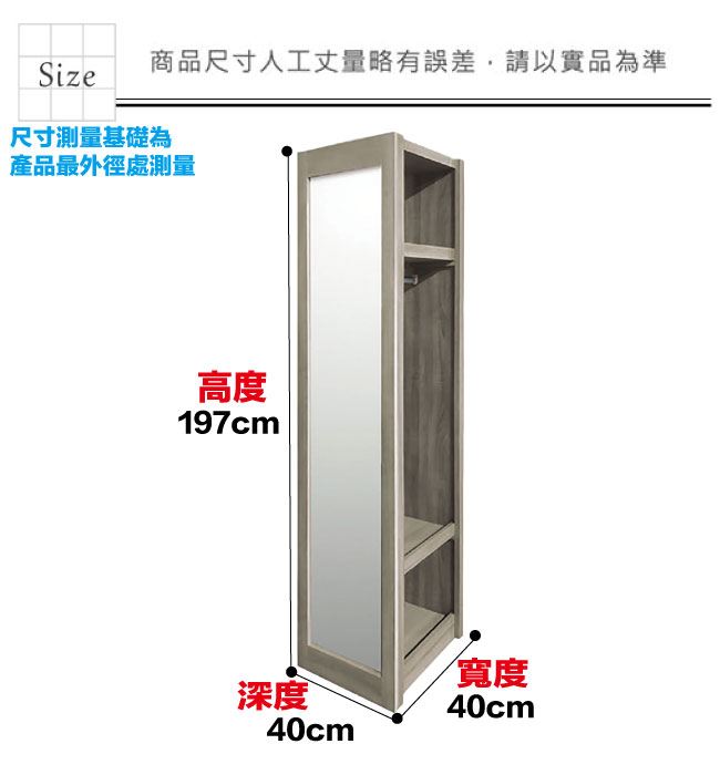 材質 | ◆產品名稱:【綠家居】邁克可1.3尺全身鏡面側邊衣櫃/收納櫃(二色可選) 尺寸:(寬)40x(深)40(高)197/公分 ◆材質: 材質:防蛀木心板+防潮耐磨腳座+強化玻璃鏡面 噴漆:防潮耐磨噴漆處理