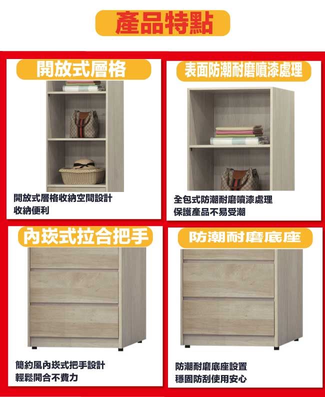 商 品 介 紹 | 【綠家居】戈壁雙色1.9尺開放式三抽側邊櫃/衣櫃 木紋雙色系+現代簡約風格+安心材質製造,使用放心+搭配居家更便利,整體採用防蛀木心板+防潮耐磨底座+五金滑軌結構等安心材質製造搭配外層採用優莉坦耐磨全包式噴漆處理 ,採用三抽屜+開放層格等收納空間設計,全由專人配送到家,專業安心服務,替你省下更多時間! 【商品特色】 木紋雙色系+現代簡約風格+安心材質製造,使用放心+搭配居家更便利 防蛀木心板+防潮耐磨底座+五金滑軌結構等安心材質製造 採用三抽屜+開放層格等收納空間設計 此商品不需要DIY組立,此商品為組立後之成品 品質保證、專業設計、貼心服務 全由專人配送到家,專業安心服務,替您省下更多時間