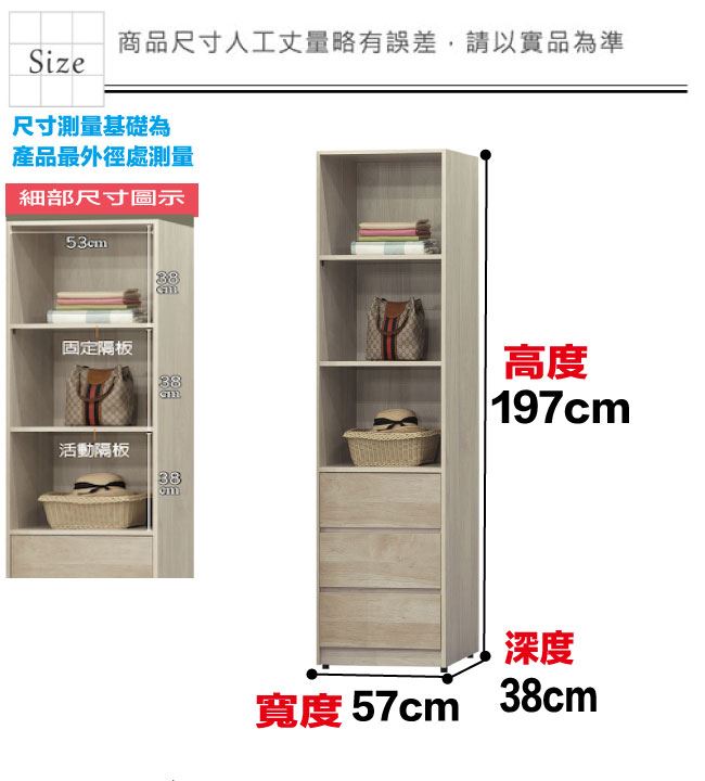 材質 | ◆產品名稱:【綠家居】戈壁雙色1.9尺開放式三抽側邊櫃/衣櫃 尺寸:(寬)57x(深)38x(高)197/公分 ◆材質: 材質:防蛀木心板+防潮耐磨底座+五金滑軌結構 噴漆:防潮耐磨噴漆處理 |