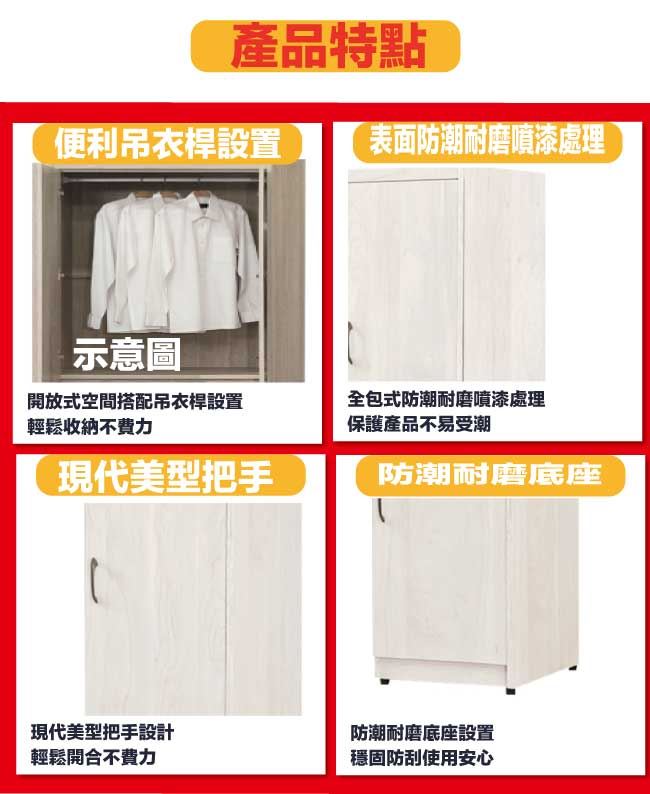 商 品 介 紹 | 【綠家居】凱萊1.3尺二門單吊衣櫃 白梧桐木紋色系+現代簡約風格+安心材質製造,使用放心+搭配居家更便利,整體採用防蛀木心板+防夾手緩衝門片五金+防潮耐磨底座等安心材質製造搭配外層採用優莉坦耐磨全包式噴漆處理 ,採用開門櫃+吊衣桿+內開放層格等收納空間設計,全由專人配送到家,專業安心服務,替你省下更多時間! 【商品特色】 白梧桐木紋色系+現代簡約風格+安心材質製造,使用放心+搭配居家更便利 防蛀木心板+防潮耐磨底座+防夾手緩衝門片五金等安心材質製造 採用開門櫃+吊衣桿+內開放層格等收納空間設計 此商品不需要DIY組立,此商品為組立後之成品 品質保證、專業設計、貼心服務 全由專人配送到家,專業安心服務,替您省下更多時間