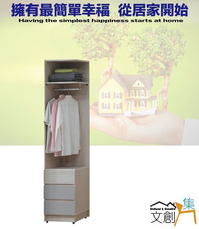 商 品 介 紹 | 【綠家居】瑞瑟雙色1.5尺開放三抽側邊衣櫃 木紋雙色系+安心材質製造,使用放心+搭配居家更便利,採用防蛀木心板+防潮耐磨底座+五金滑軌結構等安心材質製造 ,外層採用防潮耐磨噴漆處理搭配採用吊衣桿+三抽屜+開放層格等收納空間設計,全由專人配送到家,專業安心服務,替你省下更多時間! 【商品特色】 木紋雙色系+安心材質製造,使用放心+搭配居家更便利 採用防蛀木心板+防潮耐磨底座+五金滑軌結構等安心材質製造 搭配採用吊衣桿+三抽屜+開放層格等收納空間設計 此商品不需要DIY組立,此商品為組立後之成品 品質保證、專業設計、貼心服務 全由專人配送到家,專業安心服務,替您省下更多時間