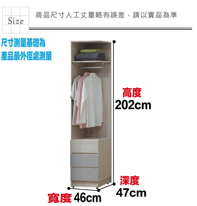 材質 | ◆產品名稱:【綠家居】瑞瑟雙色1.5尺開放三抽側邊衣櫃 尺寸:(寬)46x(深)47x(高)202/公分 ◆材質: 材質:防蛀木心板+防潮耐磨底座+五金滑軌結構 噴漆:防潮耐磨噴漆處理 |