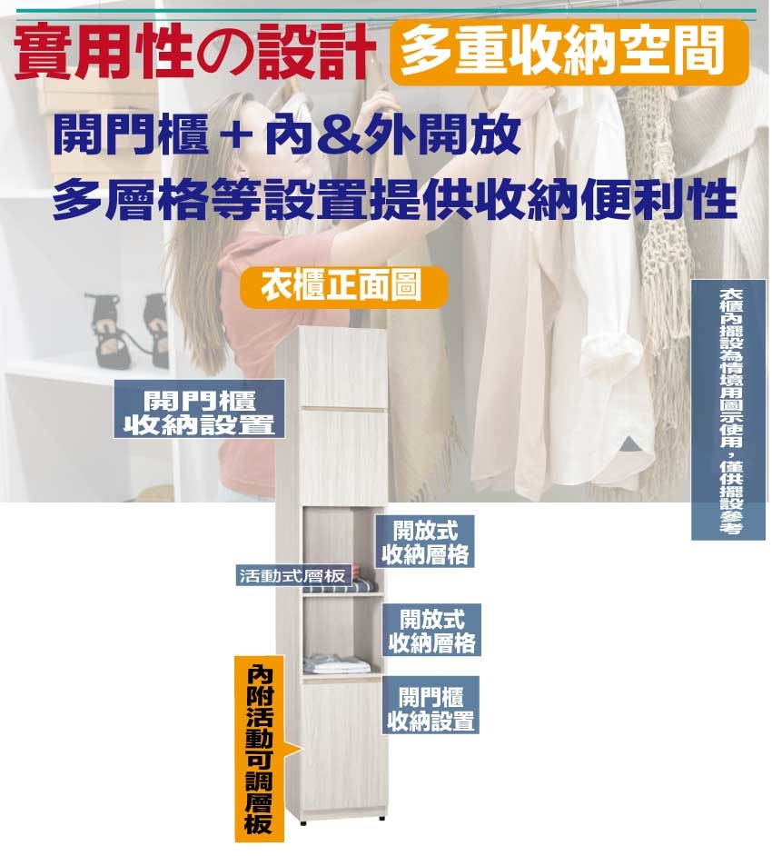 搭配採用開門櫃+內&外開放層格等收納空間設計