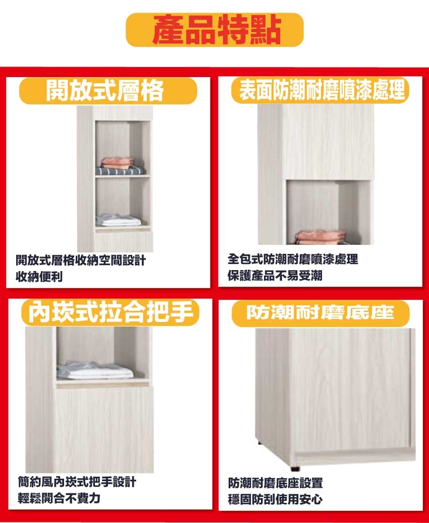 材質:防蛀木心板+防潮耐磨腳座+防夾手緩衝門片五金
