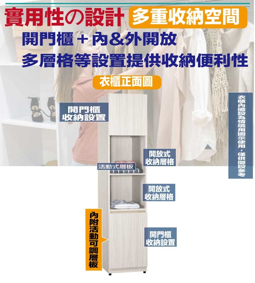 搭配採用開門櫃+內&外開放層格等收納空間設計