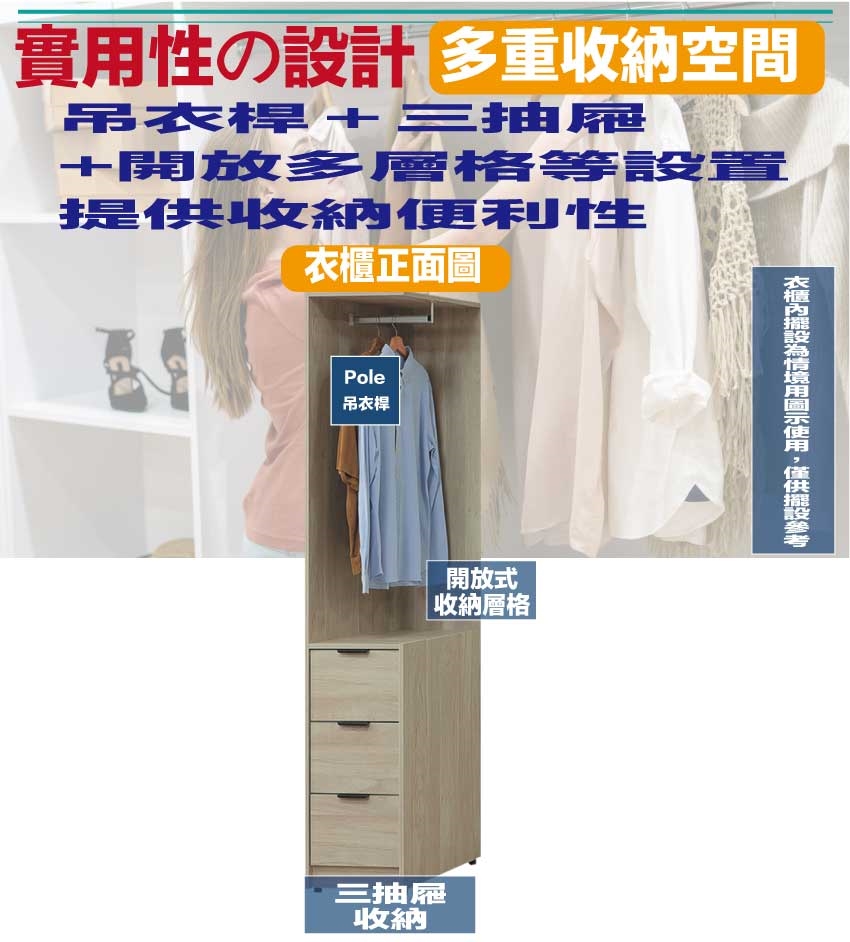 吊衣桿+三抽屜+開放層格