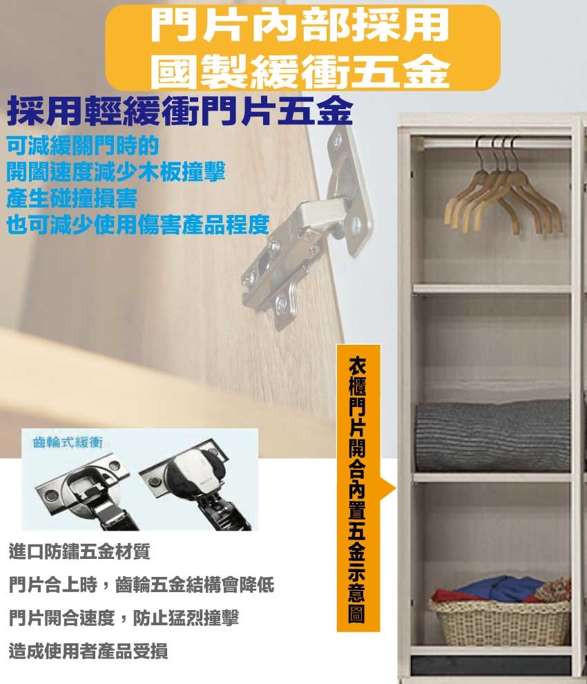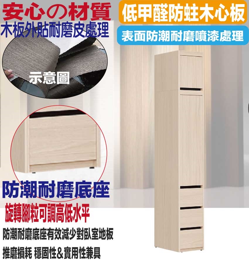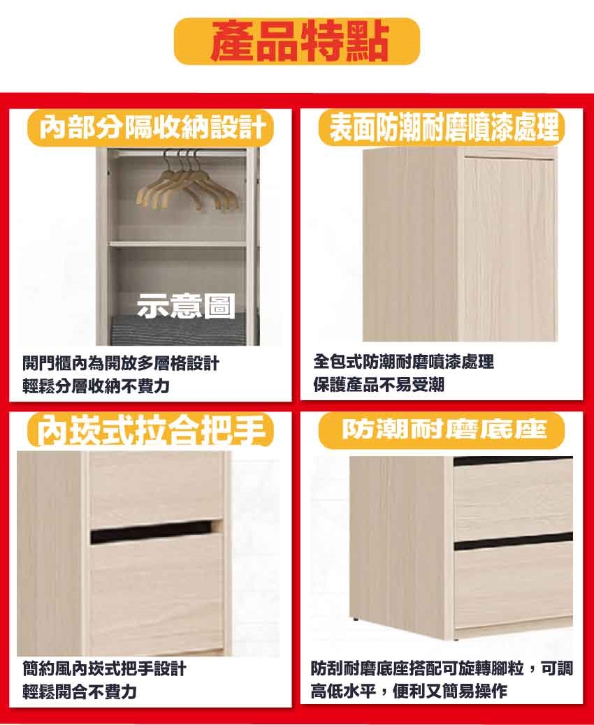 材質:防蛀木心板+防潮耐磨底座(可調高低水平)+防夾手緩衝門片五金
