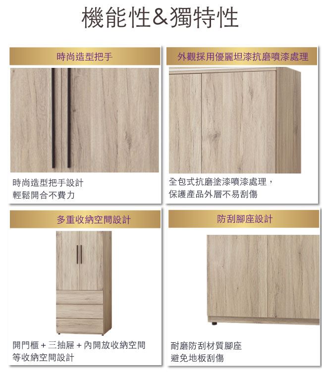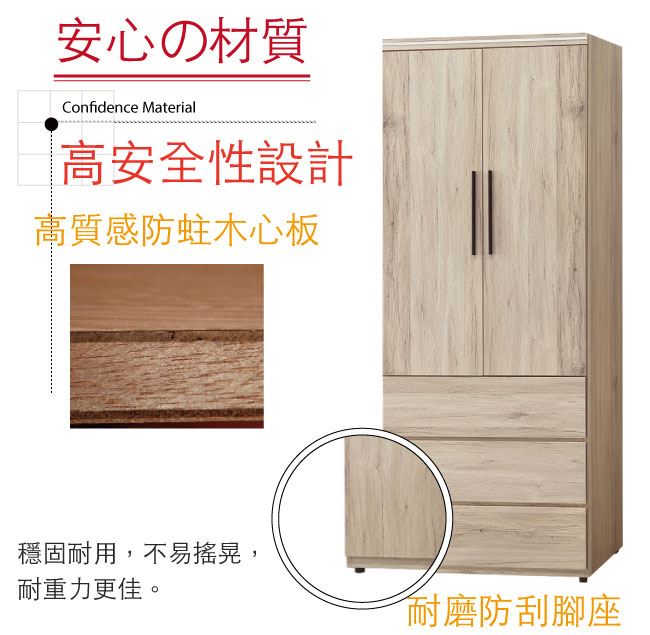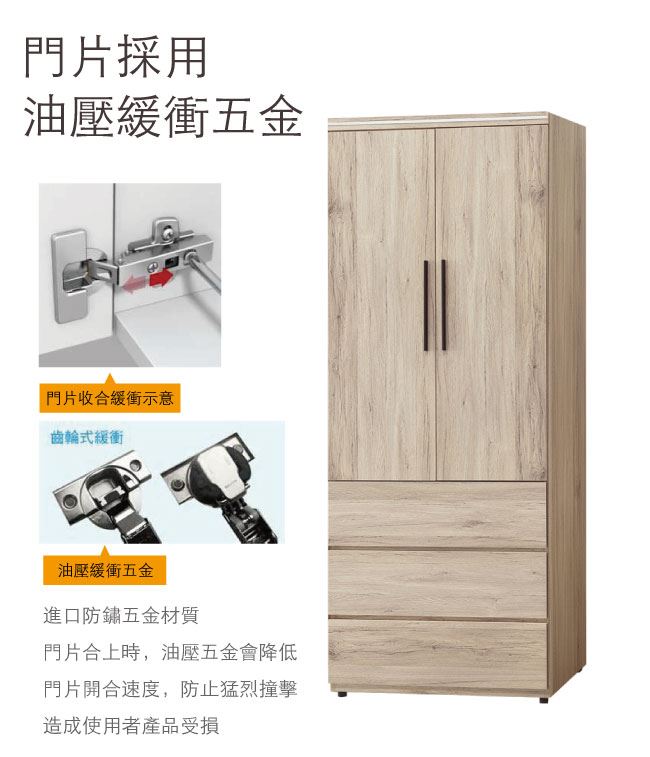 商品介紹 | 【綠家居】莉歐 現代2.5尺二門三抽衣櫃/收納櫃 橡木紋色系+現代簡約風格+安心材質製造,整體採用防蛀木心板+防刮耐磨腳座+五金滑軌結構+防夾手緩衝門片五金等安心材質製造,外層採用優利坦全包式耐磨噴漆處理搭配開門櫃+吊衣桿+三抽屜+內開放式收納等收納設計,全由專人配送到家,專業安心服務,替你省下更多時間! 【商品特色】 橡木紋色系+現代簡約風格+安心材質製造,使用放心+搭配居家更便利 採用防蛀木心板+防刮耐磨腳座+五金滑軌結構+防夾手緩衝門片五金等安心材質製造 開門櫃+吊衣桿+三抽屜+內開放式收納等收納設計 此商品不需要DIY組立,此商品為組立後之成品 品質保證、專業設計、貼心服務 全由專人配送到家,專業安心服務,替您省下更多時間 |