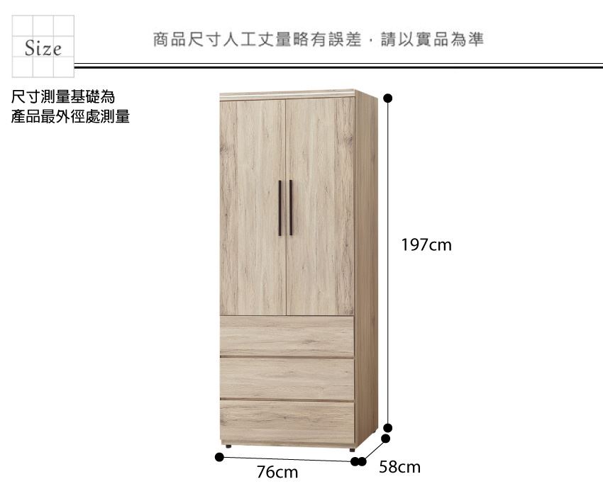 材質 | ◆產品名稱:【綠家居】 莉歐 現代2.5尺二門三抽衣櫃/收納櫃 產品尺寸: 收納櫃尺寸:(寬)76x(深)58x(高)197/公分 ◆材質: 材質:防蛀木心板+防刮耐磨腳座 材質:防夾手緩衝門片五金+五金滑軌結構 塗漆:優利坦全包式耐磨噴漆處理 |