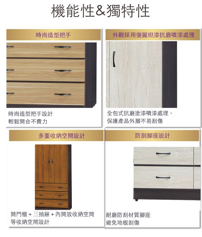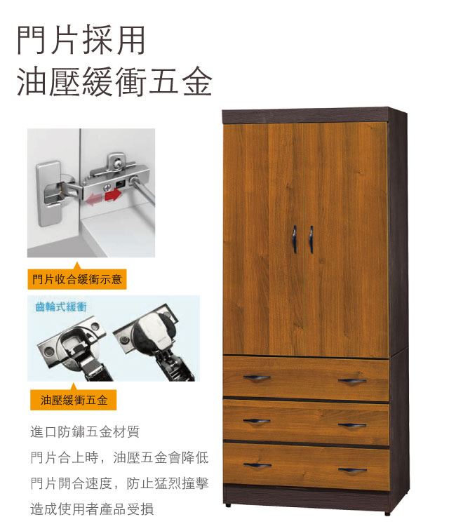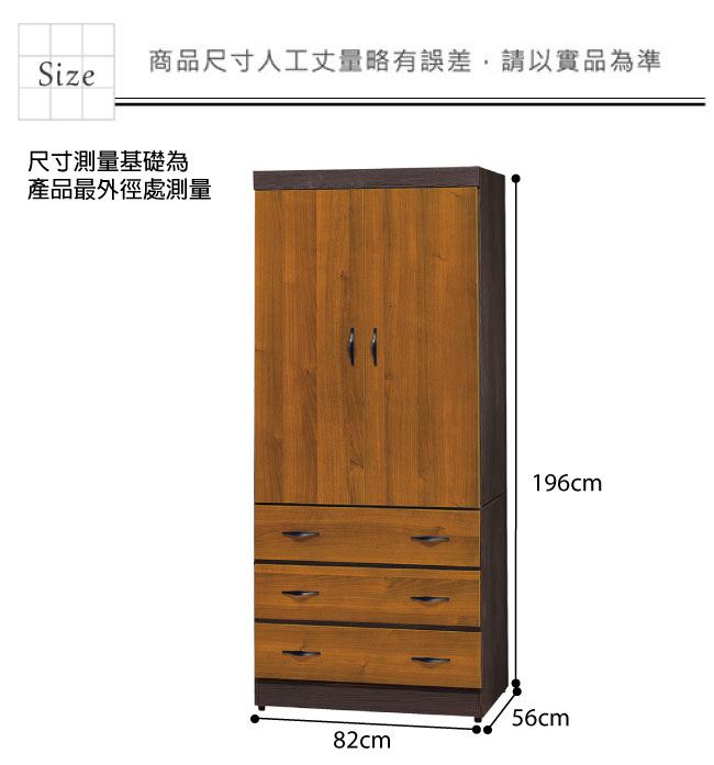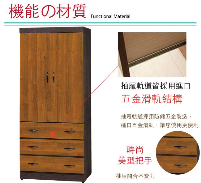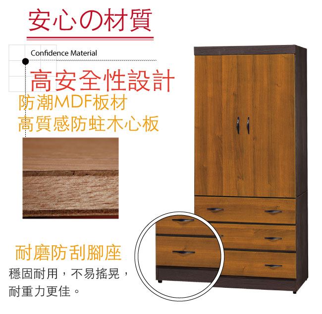 材質 | ◆產品名稱:【綠家居】斯里蘭 現代2.7尺二門三抽衣櫃/收納櫃(三色可選) 尺寸:(寬)82x(深)56x(高)196/公分 ◆材質: 材質:防蛀木心板+防潮MDF板材+五金滑軌結構+防夾手緩衝門片五金 塗漆:優利坦全包式耐磨噴漆處理 |